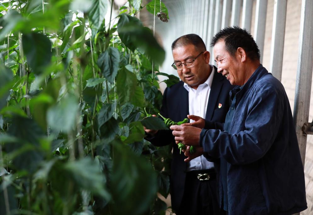在富民新村種植區(qū)的日光溫室內(nèi),富民新村黨委書記兼村委會(huì)主任張延堂(左)在與種植戶何振田查看辣椒長勢。新華社記者 郭剛 攝