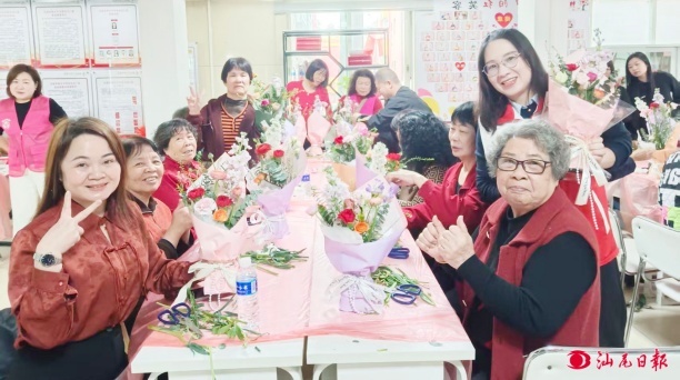 南門(mén)社區(qū)舉行"趣味手勢(shì)舞"、插花等活動(dòng)歡慶"三八"節(jié)。圖為插花現(xiàn)場(chǎng)。