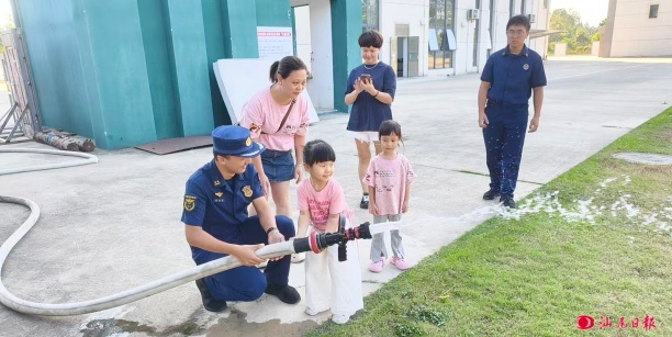小朋友在消防員的指導(dǎo)下,體驗(yàn)滅火水槍操作流程。