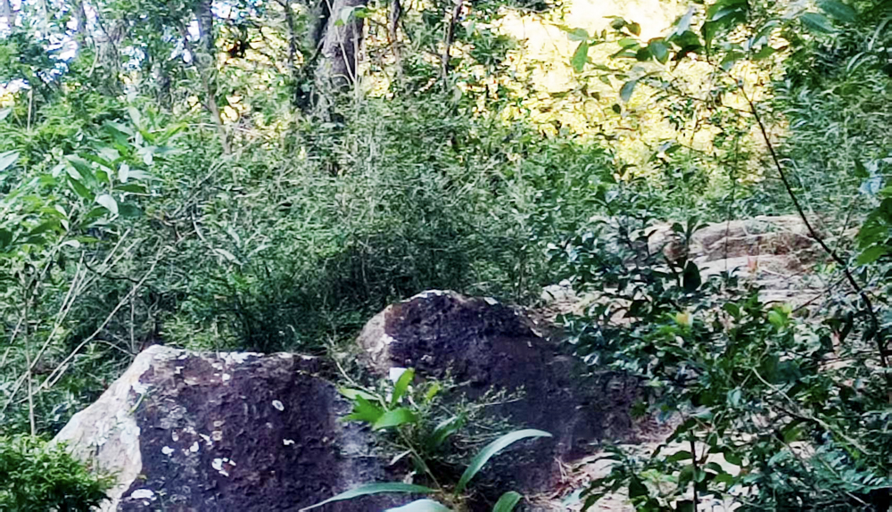 過(guò)一條鋪建在峽谷上的小橋來(lái)到左側(cè)山峰。在一路況崎嶇的羊腸小道,一側(cè)是懸崖,另一側(cè)是峭壁,左右草本掩蔽,橫柯上蔽,在晝猶昏。小路曲曲彎彎細(xì)又長(zhǎng),蜿蜒地伸向大山的密林深處。沿途有亂石,有雜草及帶刺的藤樹(shù),同伴不時(shí)提醒要小心,防止滑跌,還輕哼起蘇聯(lián)歌曲《小路》:“一條小路曲曲彎彎細(xì)又長(zhǎng),一直通往迷霧的遠(yuǎn)方。 我要沿著這條細(xì)長(zhǎng)的小路,跟著我的愛(ài)人上戰(zhàn)場(chǎng)……”歌聲讓我想起黃強(qiáng)、彭鏗、藍(lán)訓(xùn)材等領(lǐng)導(dǎo)工農(nóng)紅軍及赤衛(wèi)隊(duì)在這片崇山峻嶺上開(kāi)展游擊戰(zhàn)爭(zhēng)的革命故事,仿佛遁入光陰的隧道,眼前浮現(xiàn)出電影中紅軍戰(zhàn)士在深山密林行軍作戰(zhàn)的畫(huà)面……