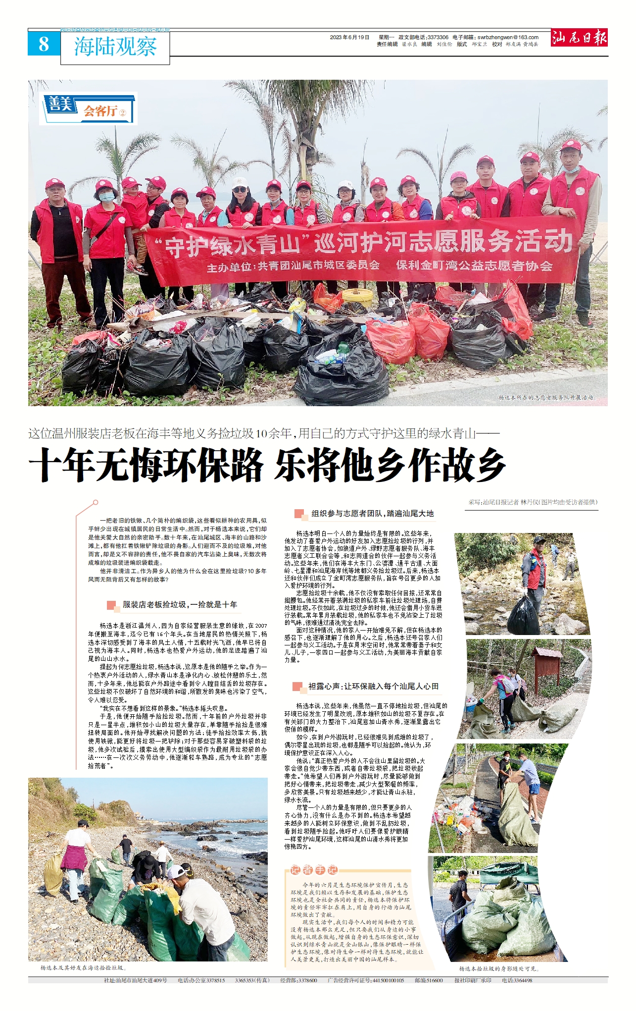 楊選本明白一個人的力量始終是有限的。這些年來,他發(fā)動了喜愛戶外運動的好友加入志愿撿垃圾的行列,并加入了志愿者協(xié)會,如狼道戶外、綠野志愿者服務(wù)隊、海豐志愿者義工聯(lián)合會等,和志同道合的伙伴一起參與義務(wù)活動。這些年來,他們在海豐大東門、公婆潭、通平古道、大面嶺、七星潭和汕尾海岸線等地都義務(wù)撿垃圾過。后來,楊選本還和伙伴們成立了金町灣志愿服務(wù)隊,旨在號召更多的人加入愛護環(huán)境的行列。