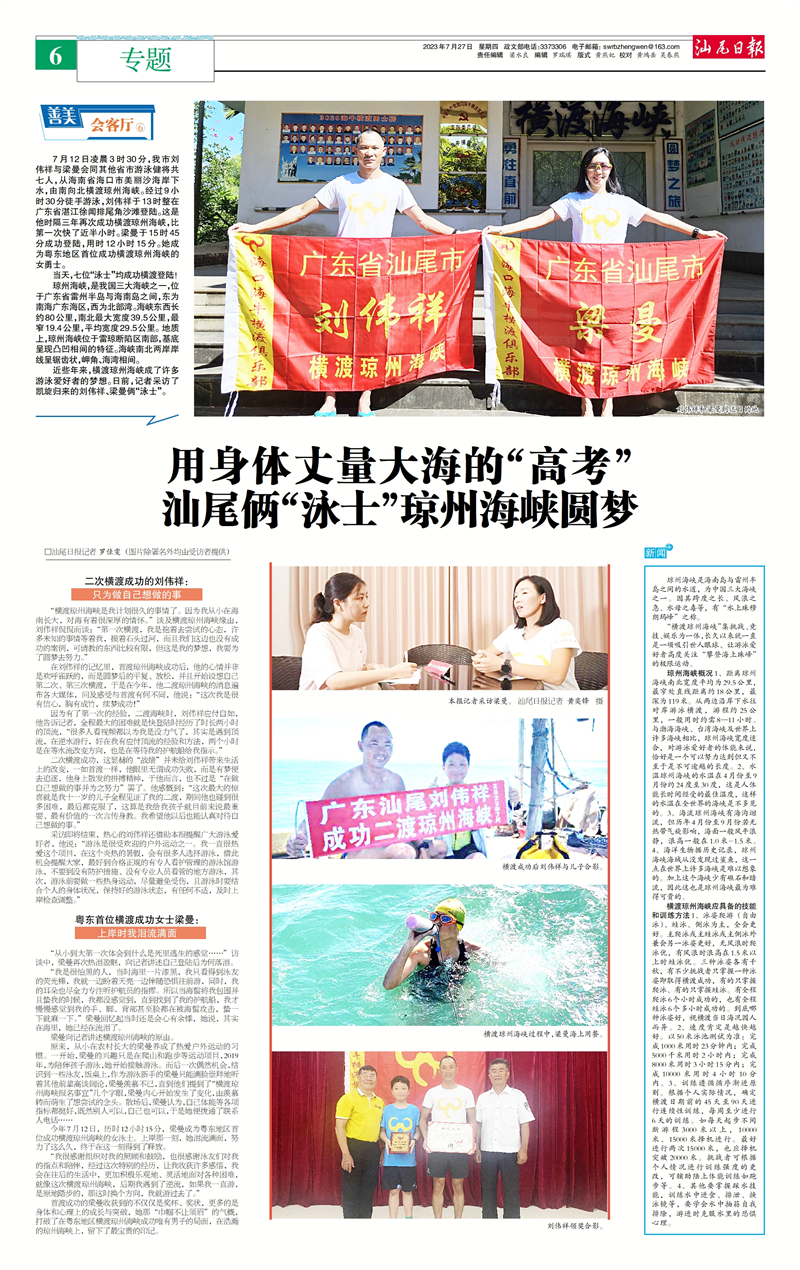 近些年來,橫渡瓊州海峽成了許多游泳愛好者的夢想。日前,記者采訪了凱旋歸來的劉偉祥、梁曼倆“泳士”。