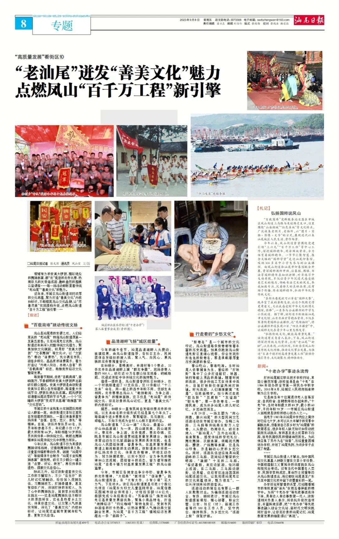 “弘揚(yáng)傳統(tǒng)文化,賦能高質(zhì)量發(fā)展?!痹摻值烙嘘P(guān)負(fù)責(zé)人表示,下來,鳳山街道將深挖傳統(tǒng)文化資源,打造“老汕尾”“新IP”,以點(diǎn)連線、以線織網(wǎng),不斷夯實(shí)鳳山街道傳統(tǒng)文化網(wǎng)格,推動(dòng)文化事業(yè)發(fā)展,為推進(jìn)“百縣千鎮(zhèn)萬村高質(zhì)量發(fā)展工程”提供價(jià)值引導(dǎo)力、文化凝聚力、精神推動(dòng)力。