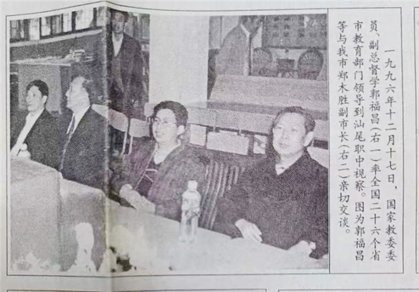 1996年12月17日,時任國家教委委員、副總督學(xué)郭福昌(右一)同志帶領(lǐng)全國26個省市教育部門領(lǐng)導(dǎo),到校視察,時任副市長鄭木勝(右二)陪同視察(資料圖)。