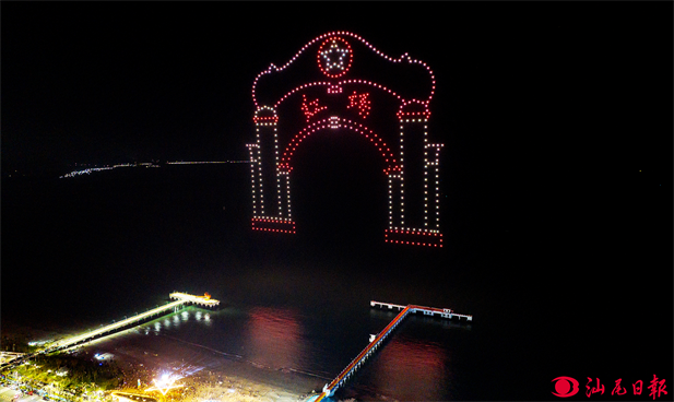 夜幕降臨,華燈初上。當(dāng)天晚8時(shí),500 架無(wú)人機(jī)宛如夜空中蘇醒的精靈,依次騰空而起。隨著“星光筑夢(mèng) 活力汕尾”八個(gè)發(fā)光大字率先在蒼穹顯現(xiàn),緊接著,“喜迎十五運(yùn)會(huì)”“沖浪健兒矯健身姿”“栩栩如生藍(lán)鯨”等字樣圖形依次亮相,還有紅宮紅場(chǎng)、時(shí)遷圖+英歌舞、漁歌圖、白字戲、媽祖像等文化符號(hào)閃耀登場(chǎng),每次無(wú)人機(jī)造型的變換,都引得市民游客陣陣歡呼,紛紛舉起手機(jī)拍照留念。整個(gè)無(wú)人機(jī)匯演持續(xù)了約20分鐘,在這短暫卻又令人難忘的時(shí)間里,汕尾的獨(dú)特魅力通過(guò)夜空的光影表演,被淋漓盡致地展現(xiàn)在眾人面前。