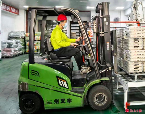 工作人員正忙碌地將封裝完畢的大米進(jìn)行轉(zhuǎn)運(yùn)。