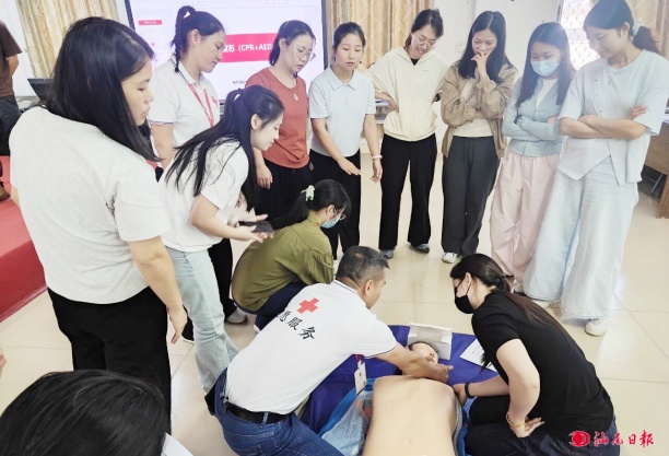 教師們?cè)趯W(xué)習(xí)心肺復(fù)蘇術(shù)。