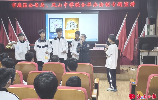 汕尾日?qǐng)?bào)訊 (記者 林卓鑫 通訊員 莊海君 文/圖) 日前,城區(qū)鳳山中學(xué)聯(lián)合城區(qū)公安分局,舉辦一場(chǎng)以“校園欺凌、交通安全、電信網(wǎng)絡(luò)詐騙”為主題的法制專題宣講活動(dòng)。