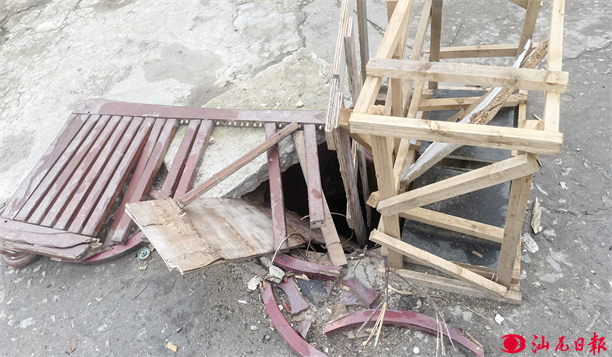 記者多次實地觀察,這里附近有密集居民區(qū),人流量很大,途經此處的電動車、自行車騎手都紛紛減速繞行,避免與這個“陷阱”發(fā)生接觸。而破舊的椅子、破損的柜子,斷落的樹枝,則是熱心市民放置在沙井上的警示標志。這些警示標志物幾日一換,可見市民的焦灼和無奈。