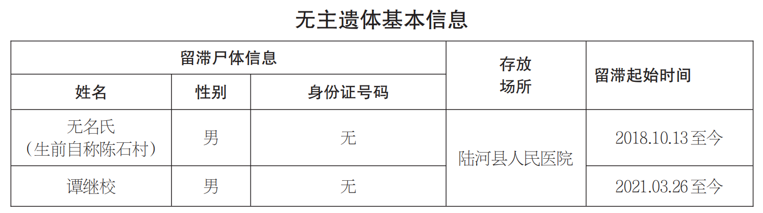 自公告發(fā)布之日起60個自然日內(nèi)仍無人認(rèn)領(lǐng)的遺體,陸河縣人民醫(yī)院將按《民法典》《殯葬管理?xiàng)l例》等相關(guān)法侓法規(guī)規(guī)定,依法申請衛(wèi)生行政主管部門和公安機(jī)關(guān)將尸體處理。
