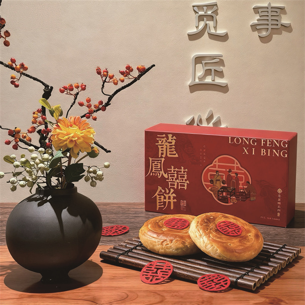 在喜覓瑤元閣的眾多產品中,最讓汕尾老百姓牽掛的莫過于龍鳳喜餅。這餅是汕尾嫁娶儀式里的“硬通貨”,餡料精選杏仁、核桃仁、瓜子仁、光中杏、欖仁等按比例搭配而成的伍仁,咬開滿是堅果油香;餅皮更見功夫,水油酥工藝要經過五次折疊、三次醒發(fā),烤好后輕碰即碎,酥皮簌簌落在掌心,卻不沾手。在全新升級的龍鳳禮盒里,伍仁喜餅與雙黃椰絲白蓮蓉喜餅分別象征著五谷豐登與連生貴子。開店至今,瑤元閣已為上萬對新人定制過龍鳳喜餅,不少在外打拼的汕尾人哪怕隔著千里,也要線上訂購,讓“家鄉(xiāng)味”見證自己的婚禮。