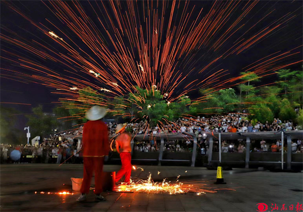 9月13日晚,絢麗的煙花拉開海豐中秋花火大會(huì)序幕。次日晚,由“火”元素構(gòu)成的非遺打鐵花、風(fēng)火輪、非遺火壺、火焰刀、火棍節(jié)目輪番登場(chǎng),吸引眾多市民游客駐足觀看。聽說有非遺打鐵花表演,攝影愛好者陳先生連忙趕到現(xiàn)場(chǎng)拍攝?!芭臄z非遺打鐵花的市民、攝影師及攝影愛好者很多,為了抓拍到好看的畫面,我只能不斷地移動(dòng)位置”。在現(xiàn)場(chǎng)忙碌拍攝的陳先生說。